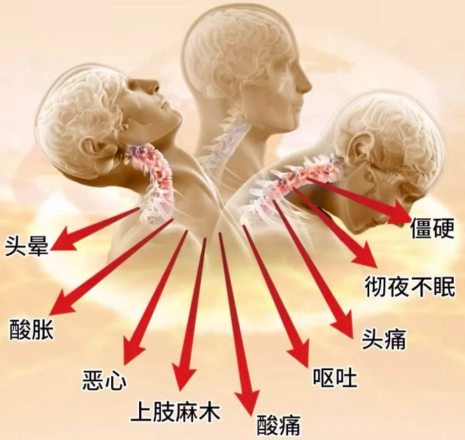 一、颈椎问题:颈椎劳损、曲度变直、反弓,颈部僵硬、脖子疼,头晕、恶心、压迫神经至手麻、眼花、后背酸胀
